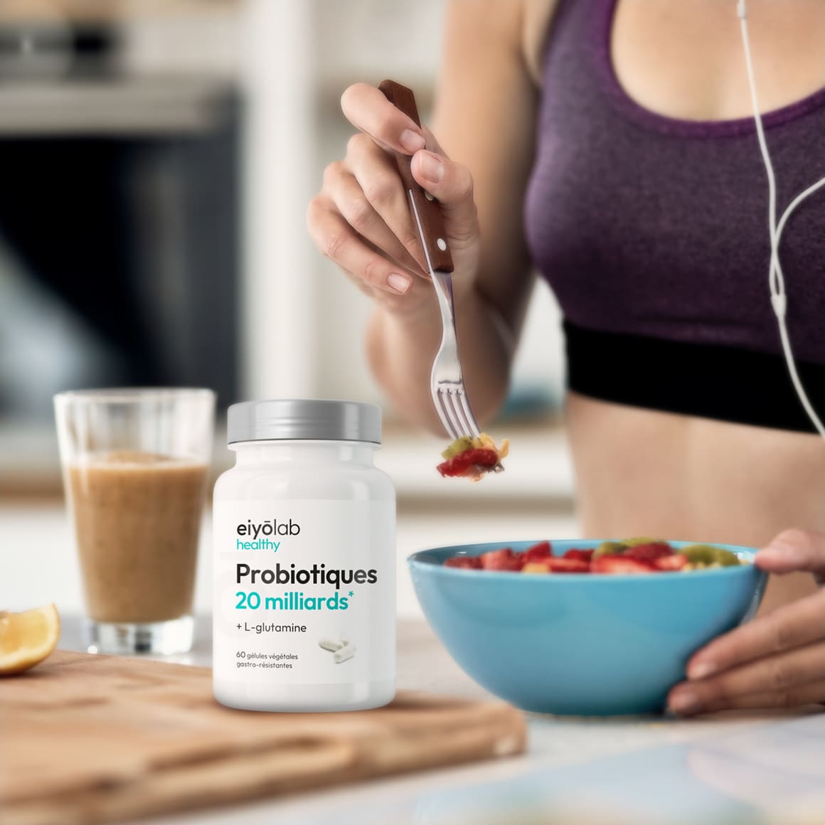 Le complexe probiotiques et glutamine Eiyolab va permettre d’équilibrer l’écosystème intestinal des sportifs. L’apport de 20 milliards de souches probiotiques spécifiquement sélectionnées combiné à de la glutamine aura une action sur l’équilibre de la flore intestinale et l’intégrité de la muqueuse réduisant ainsi les inconforts digestifs et favorisant la perte de poids et un ventre plat.