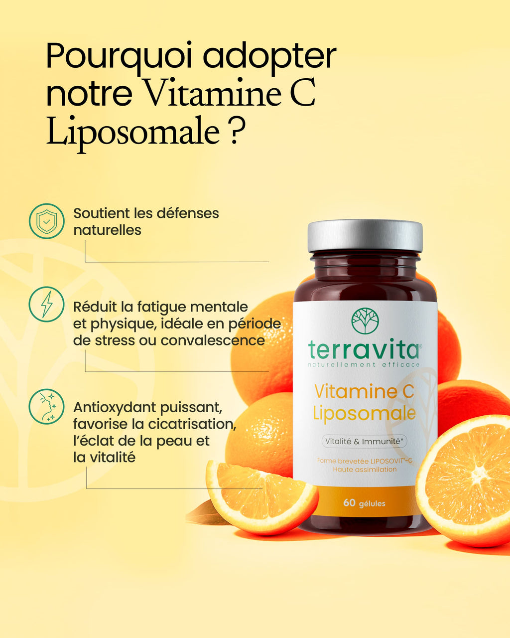 Véritable coup de fouet naturel, la Vitamine C Liposovit-C® de Terravita est ton alliée idéale pour renforcer ton système immunitaire, lutter contre la fatigue et booster ton tonus au quotidien.