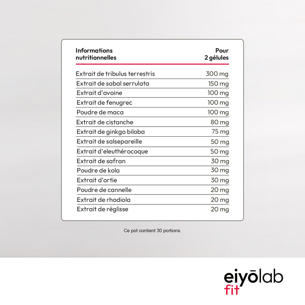 Extrait de fruit de tribulus (Tribulus terrestris L.), gélule d’origine végétale, extrait de fruit de saw palmetto (Serenoa repens (W.Bartram) Small), poudre de racine de maca (Lepidium meyenii Walp.), extrait de graine de fenugrec (Trigonella foenum-graecum L.), extrait de tige d’avoine (Avena sativa L.) (gluten), extrait de tige de cistanche (Cistanche salsa (C.A. Mey.) G. Beck), extrait de feuille de ginkgo (Ginkgo biloba L.), extrait de racine de salsepareille (Smilax officinalis Kunth), extrait de racine d’eleuthérocoque (Eleutherococcus senticosus (Rupr. et Maxim.) Maxim), poudre de graine de kola (Cola nitida (Vent.) Schott et Endl.), extrait de feuille d’ortie (Urtica dioica L.), extrait de stigmate de safran (Crocus sativus L.), poudre d’écorce de cannelle (Cinnamomum verum J. Presl), extrait de racine de rhodiole (Rhodiola rosea L. (Sedum roseum (L.) Scop.), extrait de racine de réglisse (Glycyrrhiza glabra L.), anti-agglomérant : carbonate de magnésium, huile de tournesol.