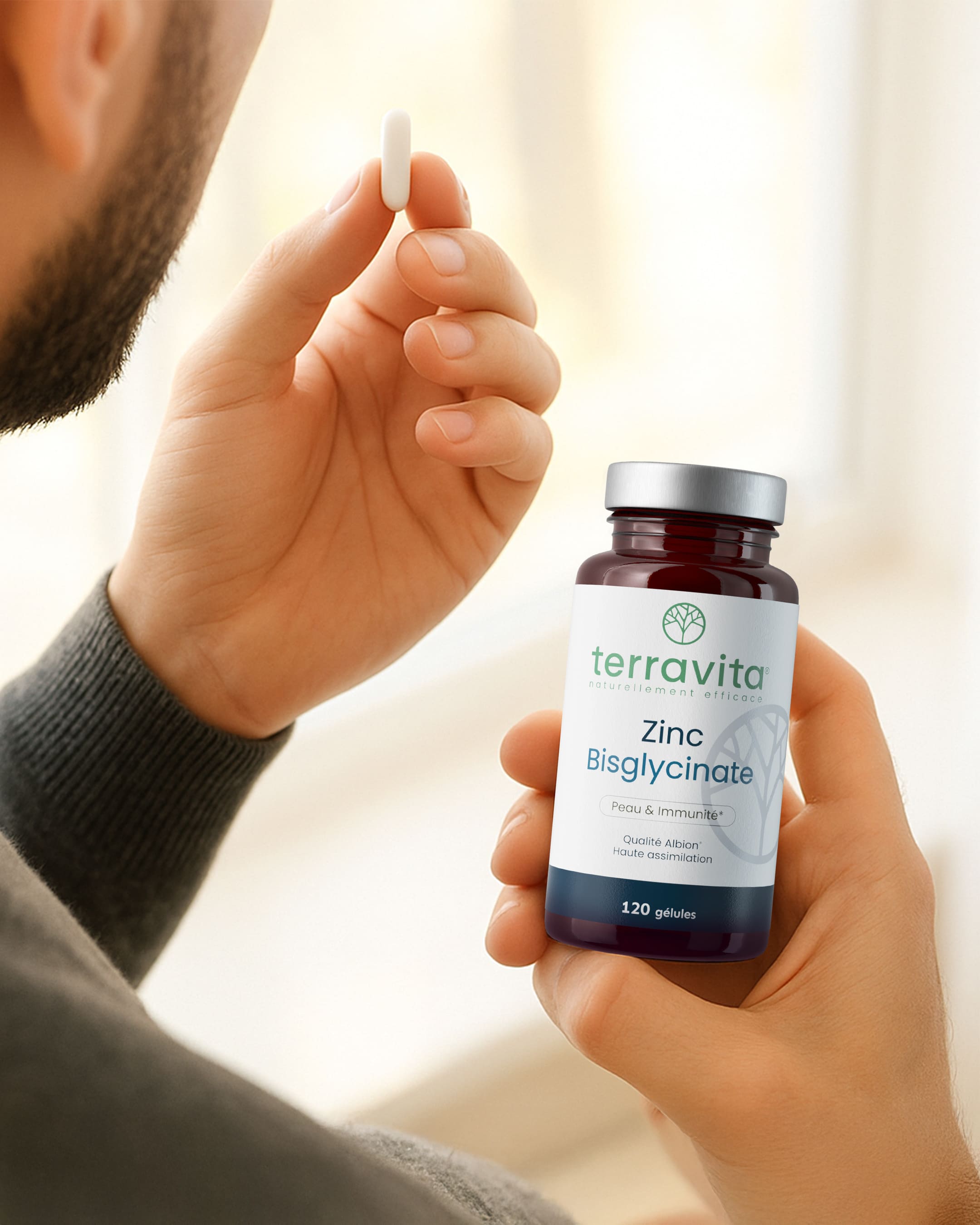 Le Zinc Bisglycinate Terravita repose sur une forme brevetée Albion®, reconnue pour sa biodisponibilité supérieure et sa grande tolérance digestive.